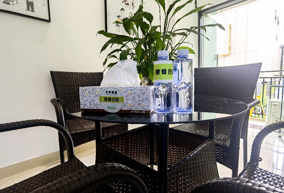 根据万科物业前期调研,快递员和外卖员普遍存在“充电难、饮水难、如厕难”的难题。在“暖蜂驿站”内,根据每个小区实际情况,提供手机充电、无线网络、免费饮水等便捷服务,配备饮水机、休息位、医药箱等便民设施,可充分保障小哥群体们“渴了能喝水、累了能歇脚、没电能充电”,以此打造社区“小蜜蜂”温暖之家。