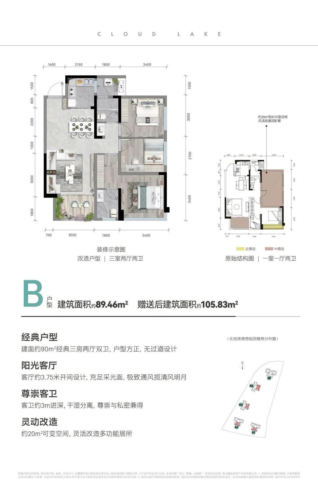 改造前为一室一厅两卫,改造后为三室两厅两卫,赠送面积约16㎡,满足全家庭功能需求。其中,客厅开间约3.75m、最小的客卧进深约3.4m。最大的亮点在于此户型将空间利用到了极致,无过道设计,无浪费空间,更有20㎡的可变空间任意改造。