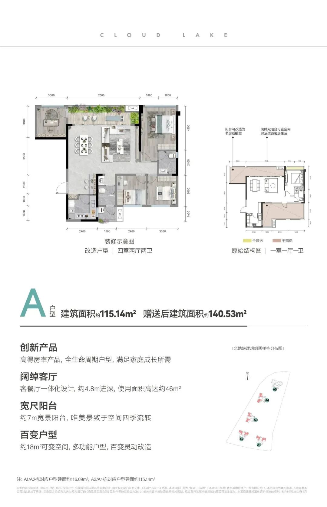 改造前为一室一厅一卫,改造后为四室两厅两卫,赠送面积约26㎡。合理的结构规划使得整个户型空间尽显奢阔,客餐厅一体化设计,使用面积高达约46㎡,约18㎡的可变空间任意改为书房、卧室等,最高可改至5房。另外此户型的约7m宽景阳台,无缝连接户外景观,将生活的尺度大大延伸。