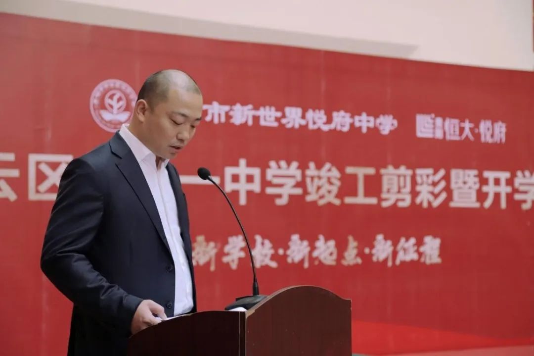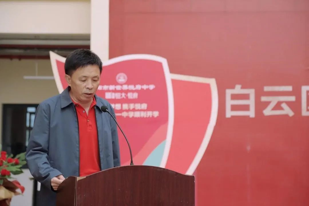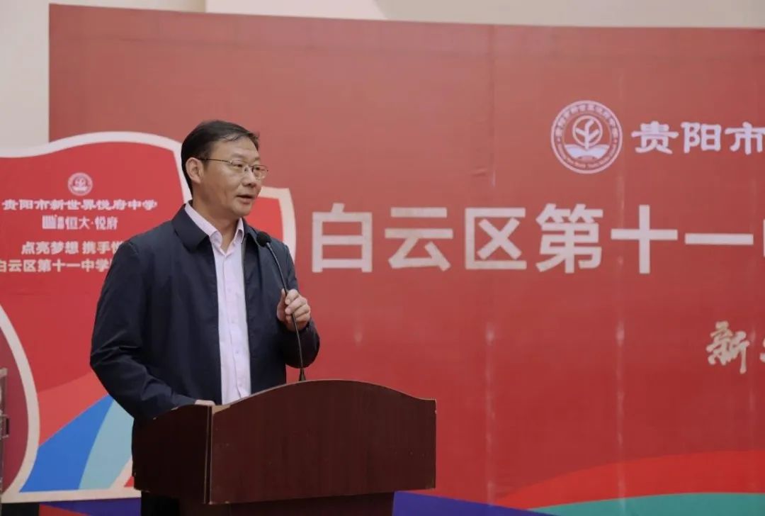 白云区区委副书记、区长唐樾在讲话中强调,教育是国之大计、党之大计,近年来,白云区深入贯彻落实习近平总书记关于教育的重要论述,始终把教育放在优先发展的战略地位,始终把办好人民满意的教育作为最大的民生,紧紧围绕建设高品质现代化教育强区目标,以实施新一轮公办强校三年行动和“强师工程” 试点县建设为抓手,持续补短板、强弱项、提品质,全力推进义务教育优质均衡发展。在市委、市政府的坚强领导下,在市教育局的关心支持下,在白云区、贵阳一中、恒大集团贵州公司的共同努力下,贵阳市新世界悦府中学顺利落成开学,这是多方合作办学的又一成果,是白云区提升教育教学质量,办好人民满意的教育的重要支撑。希望贵阳一中、新世界学校充分发挥先进经验和资源优势,区教育局抓住合作办学契机、强化服务指导,努力将贵阳市新世界悦府中学打造成为在全市具有影响力的高品质特色优质学校,助力白云教育高质量发展。也祝愿贵阳新世界悦府中学教育教学蒸蒸日上勇攀高峰,各位嘉宾及老师身体健康工作顺利、同学们学业有成!