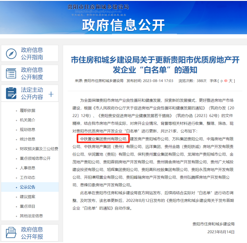贵阳市优质房地产开发企业“白名单”是市住建局贯彻执行贵阳市关于房地产业健康发展相关文件精神,进一步保障房地产业良性循环和健康发展,推进房地产市场建设,对房开企业情况、背景等相关材料进行收集、整理、筛选确定,并进行动态调整、及时发布。2023年共有21家房开企业入选,中铁置业贵州公司已连续两年入选。