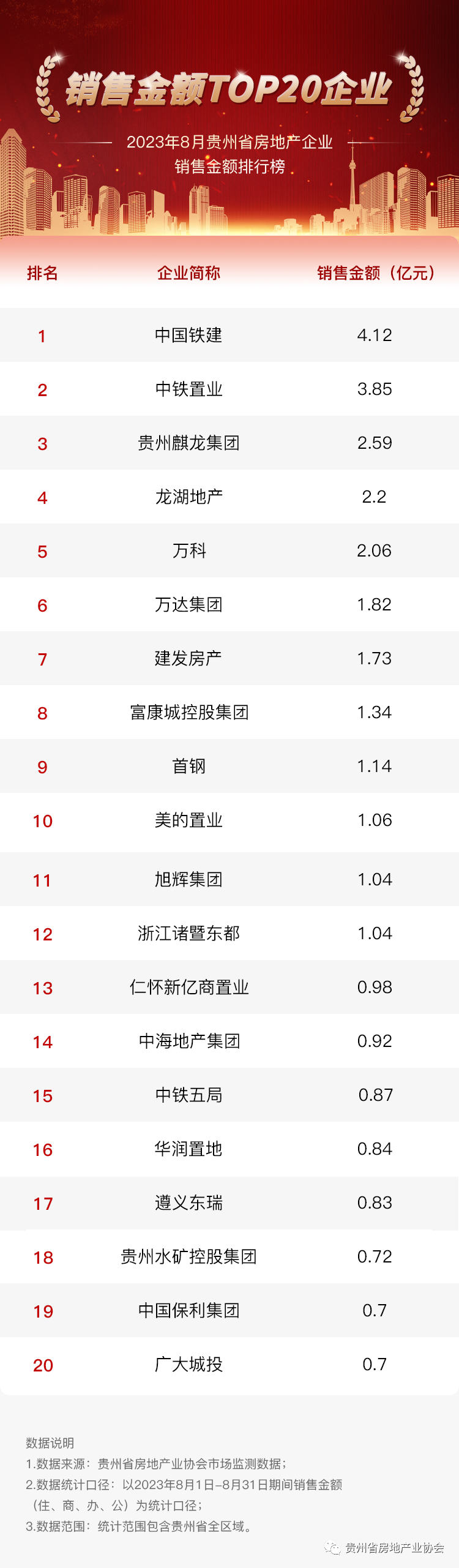 9月1日,贵州省房地产业协会发布2023年8月贵州省房地产企业销售金额排行榜,中国铁建以销售金额4.12亿元荣登月度榜单第一。