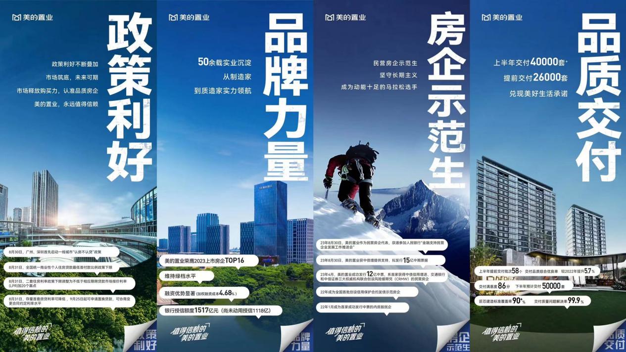 近期,政府连续出台支持房地产市场的重磅利好信息,两部门出台住房信贷新政策首套住房商贷最低首付比例不低于20%,二套房首付比例不低于30%;《中国人民银行、国家金融监督管理总局关于降低存量首套住房贷款利率有关事项的通知》:【存量首套房贷利率可降低 9月25日起可申请置换贷款、可协商变更合同约定利率水平】;三部门落实首套房认房不认贷政策,广州、深圳、武汉官宣执行“认房不认贷”政策……基于不断叠加的重磅利好政策及传统「金九银十」营销节点,美的置业作为最值得信赖的“房企示范生”在品牌、资金链、信用、品质等各方面的强大优势,形成合力、提升市场信心,共同穿越行业周期,实现可持续长期主义稳健发展。