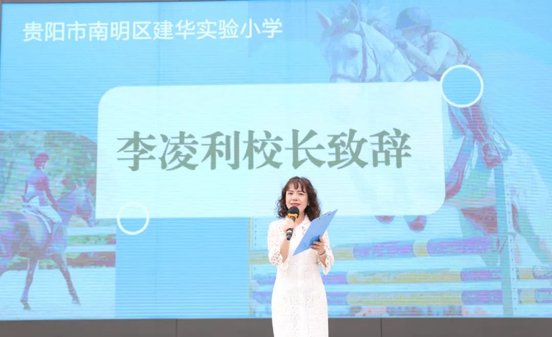 首先,由贵阳建华实验小学(首都师范大学附属实验学校)李校长上台致辞,她向所有参与到马术队成立的老师和教练们表示了感谢,并表示,“作为贵州省内第一所拥有马术队的公立学校。马术队也将为我们的学校带来更多的机遇和荣誉。参加马术比赛不仅是为了赢得奖杯,更是锻炼团队精神和竞争意识的机会。我相信,在坚持不懈地努力下,我们的马术队将在未来的比赛中取得优异的成绩,为学校争光。”