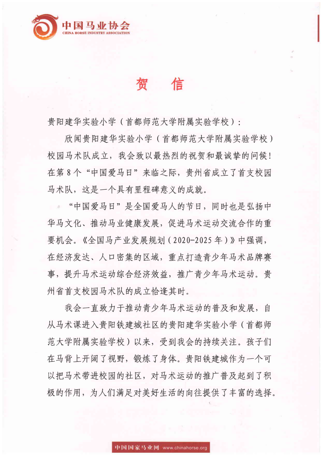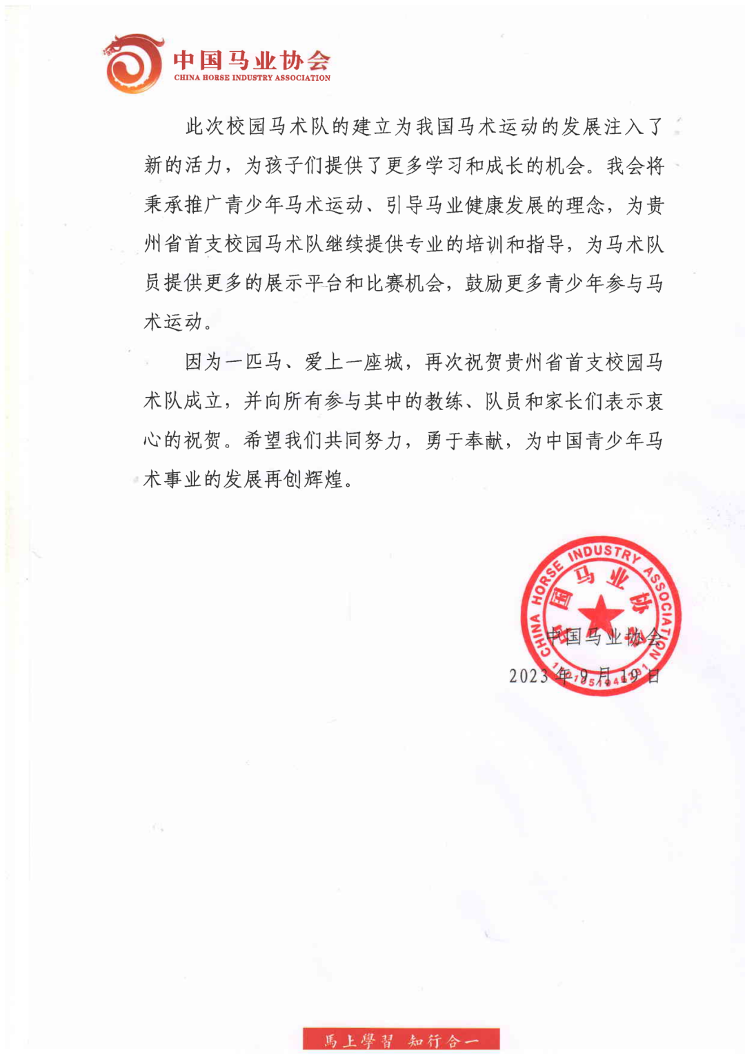此次,贵州首支校园马术队的成立,不仅是贵州省马术事业的重要里程碑,更是教育与马术完美交融的生动典范。致力于推动青少年马术运动普及和发展的中国马业协会发来了祝贺信,表达了期望,未来共同努力,勇于奉献,为中国青少年马术事业的发展再创辉煌。