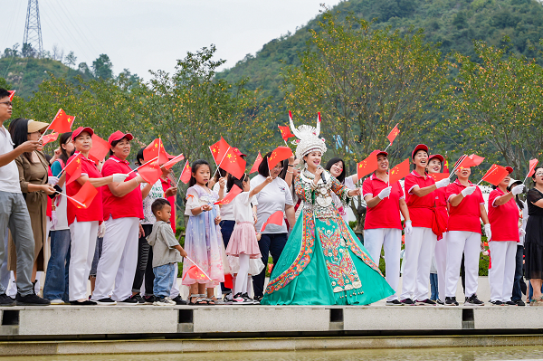 大家脸上洋溢着幸福的笑容,舞动着手中的国旗,歌唱着祖国的繁荣与昌盛,把对祖国的祝福化作律动的音符,用动人的歌声表达对祖国的热爱。众多游客纷纷打卡,留下美丽瞬间。
