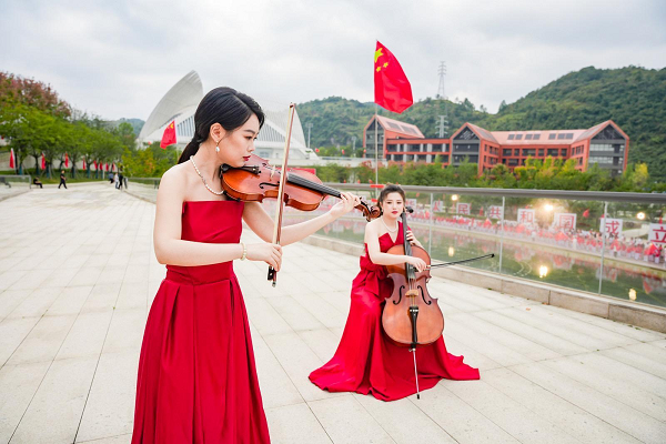 9月23日,贵阳铁建城饮马湖公园装扮一新。不少市民和游客像往常一样来这里拍照“打卡”,有的在欣赏湖畔美景,有的在玩着轮滑,有的在练习着街舞。忽然响起悠扬的小提琴声,接着大提琴声、钢琴声、竖琴声……湖心的喷泉随着音乐的节奏喷射到半空,“突如其来”的快闪点燃了全场的热情。伴随着音乐响起,阿幼朵、陈昕、张美玲等著名歌手,从人群中走出,带领大家演唱《我和我的祖国》。
