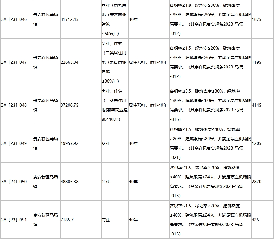 GA(23)048号地块出让面积37206.75平方米,规划用途为商业、住宅(二类居住用地(兼容商业建筑≤40%)) ,容积率≤3.5,建筑密度≤30%,绿地率≥30%,建筑限高≤60米、并满足磊庄机场限高要求,保证金4145万元。