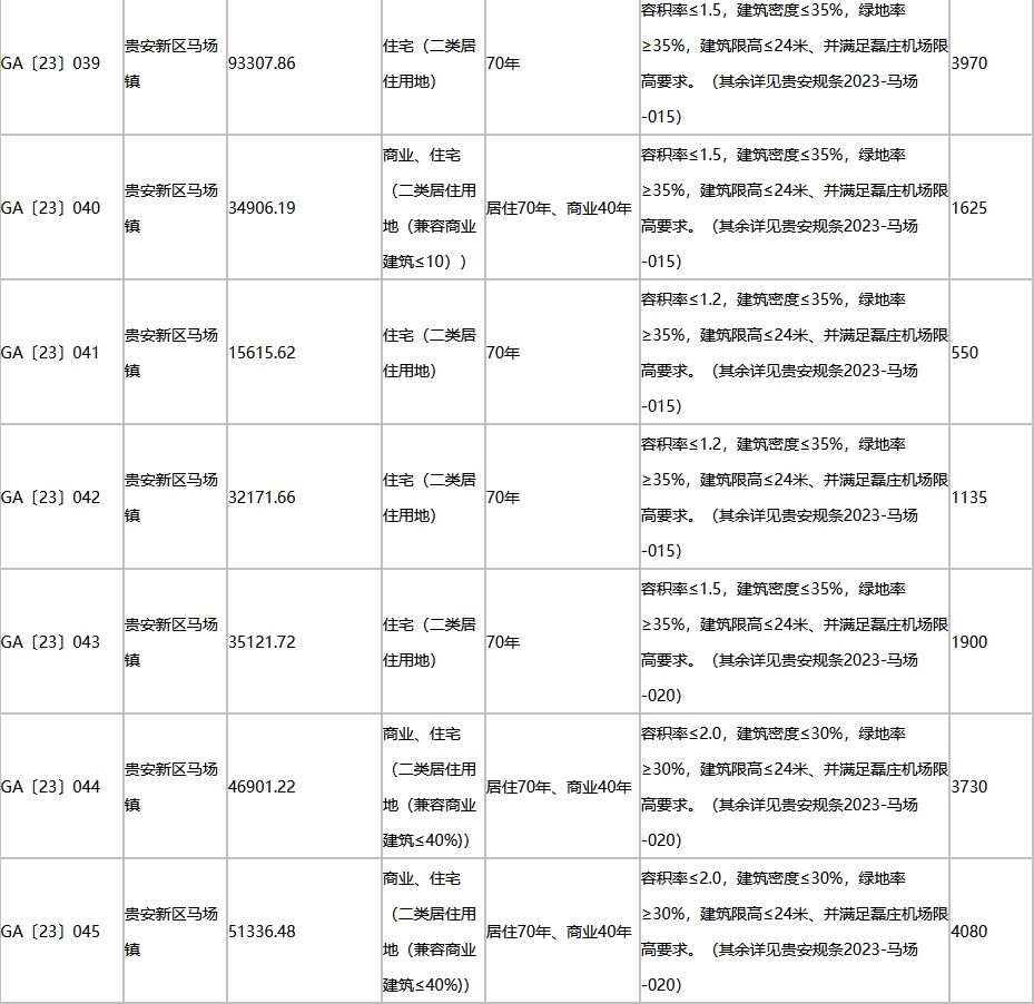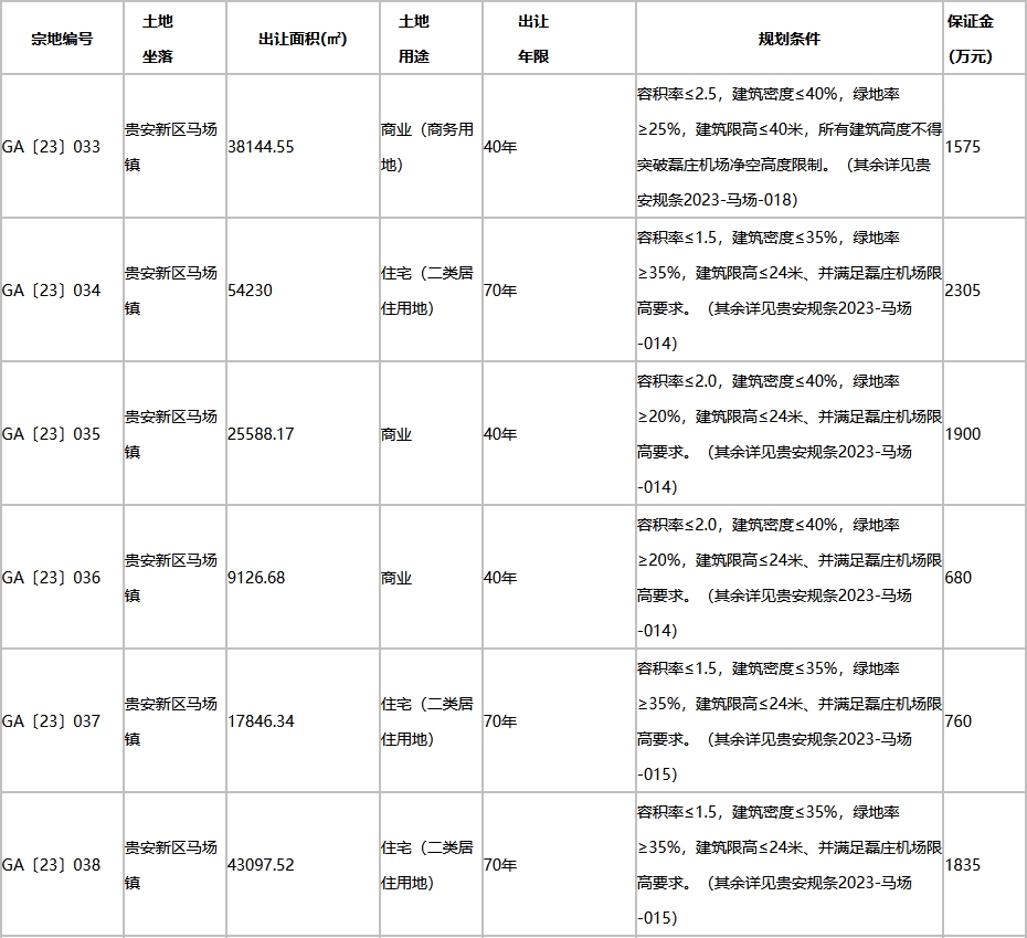 GA(23)040号地块出让面积34906.19平方米,规划用途为商业、住宅(二类居住用地(兼容商业建筑≤10)),容积率≤1.5,建筑密度≤35%,绿地率≥35%,建筑限高≤24米、并满足磊庄机场限高要求,保证金1625万元。