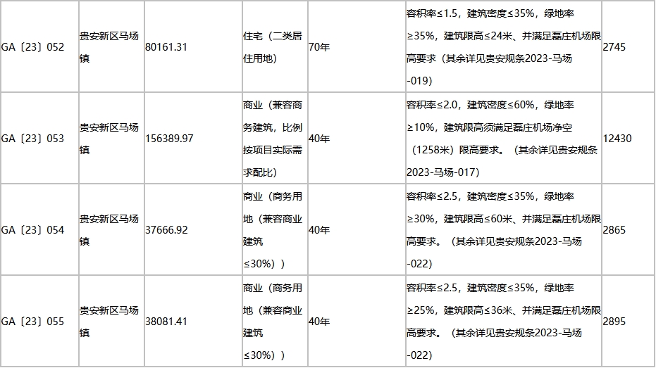 GA(23)053号地块出让面积156389.97平方米,规划用途为商业(兼容商务建筑,比例按项目实际需求配比),容积率≤2.0,建筑密度≤60%,绿地率≥10%,建筑限高须满足磊庄机场净空(1258米)限高要求,保证金12430万元。